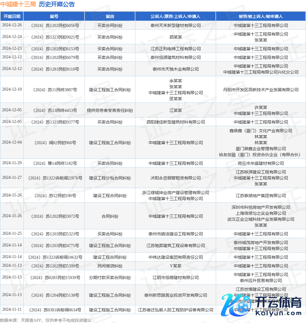 案号:(2024)苏12民初100号审理法院:江苏省泰州市中级东谈主民法院案由:树立工程协议纠纷当事东谈主信息: 原告/上诉东谈主:浙江绿城珅业房产树立处置有限公司、中城建第十三工程局有限公司 被告/被上诉东谈主:江苏泰湖地产集团有限公司开庭日历:2024年11月26日笔据统计,近一年内以中城建第十三工程局有限公司为当事东谈主的历史开庭公告有134则,其中案由为“生意协议纠纷”的公告以34则居首,其次为“树立工程施工协议纠纷”有27则,“树立工程分包协议纠纷”有17则。历史开庭公告(前20条)如下: