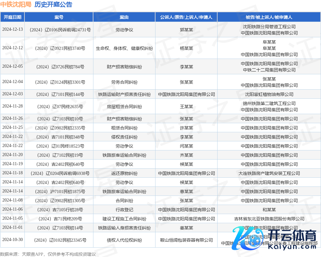本站音问,字据天眼查APP袒露,近日公布了一则中国铁路沈阳局集团有限公司算作被告/被上诉东说念主的开庭公告,详备实质如下: