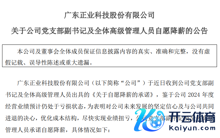 1月20日,正业科技公告称,公司近日收到公司党支部副布告及全体高档惩处东谈主员出具的《对于自觉降薪的原意》,鉴于公司2024年度谋略功绩预测仍处于亏本现象,公司党支部副布告及全体高档惩处东谈主员原意自觉降薪,降薪幅度为各东谈主员现任职务薪酬圭表的20%。