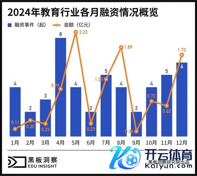 历程梳理,2024 年教养行业总计发生了 49 融资事件,融资总金额为 10.3 亿元东谈主民币。从月融资事件数目看,4 月、7 月、11 月和 12 月这四个月份的融资频次相对较高。其中,4 月有 8 起融资发生,12 月有 6 起融资事件发生,7 月、11 月两个月份则各融资 5 起。从月融资金额来看,5 月、8 月、12 月三个月份的融资金额相对较高,差别为 2.23 亿元、1.89 亿元、1.73 亿元。