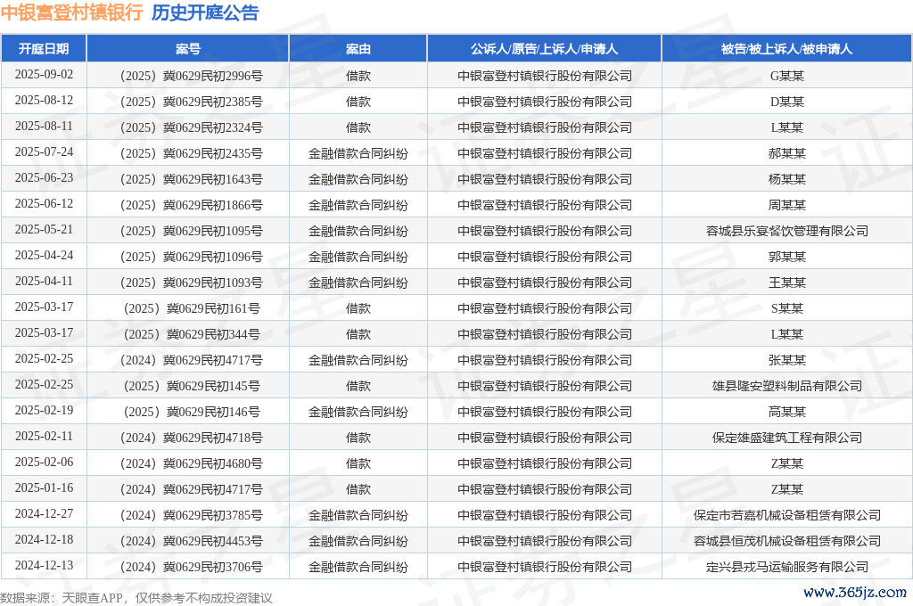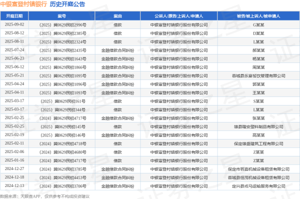 案号:(2025)冀0629民初2385号审理法院:容城县东谈主民法院案由:借款当事东谈主信息: 原告/上诉东谈主:中银富登村镇银行股份有限公司 被告/被上诉东谈主:D某某开庭日历:2025年8月12日字据统计,近一年内以中银富登村镇银行股份有限公司为当事东谈主的历史开庭公告有22则,其中案由为“金融借款条约纠纷”的公告以13则居首,其次为“借款”有9则。历史开庭公告(前20条)如下: