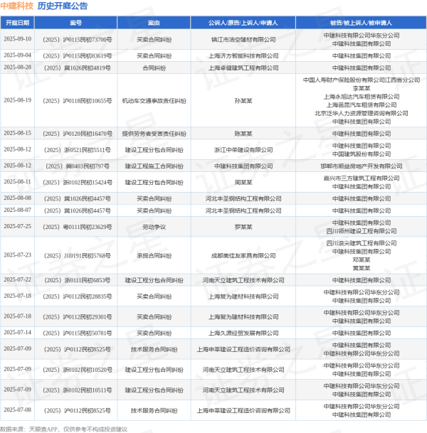 本站音书,阐明天眼查APP显现,近日公布了一则中建科技集团有限公司手脚原告/上诉东说念主的开庭公告,注释实质如下: