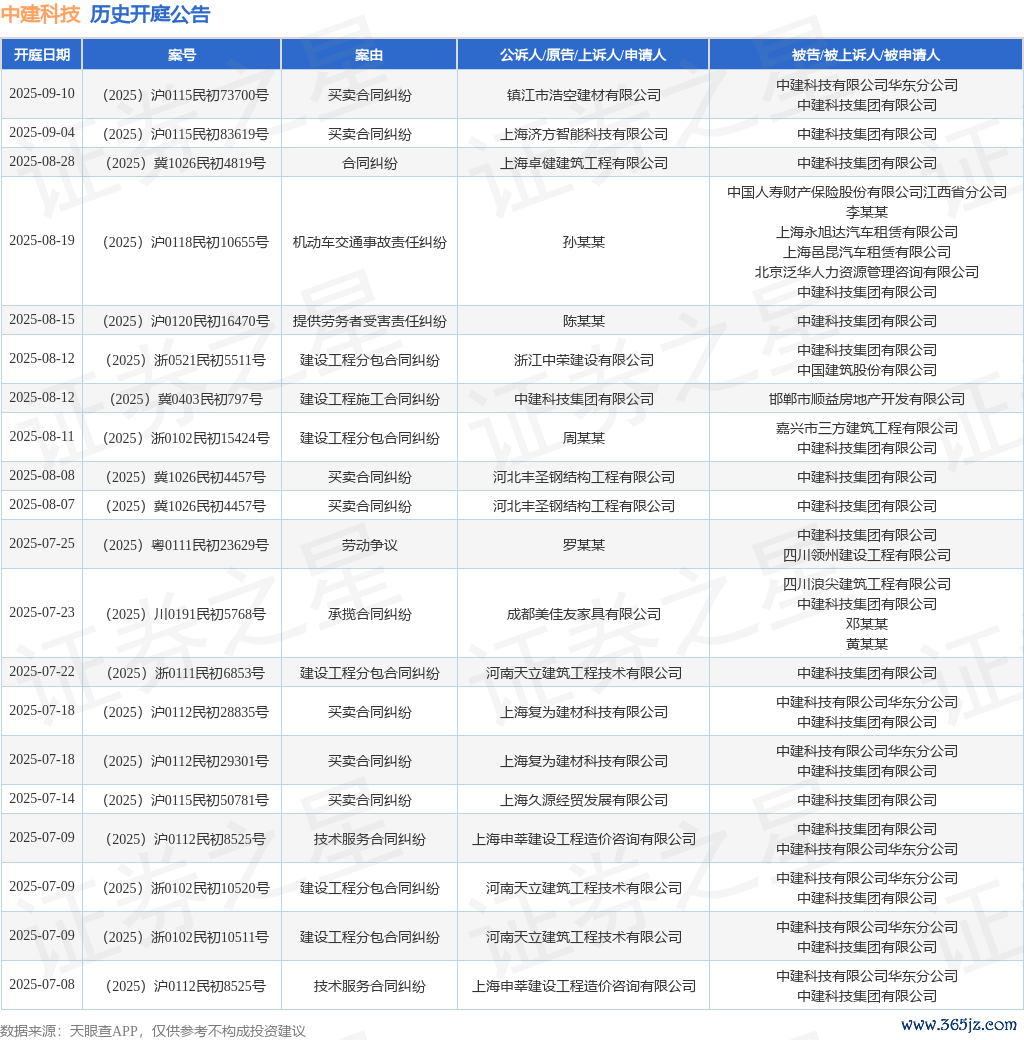 案号:(2025)冀0403民初797号审理法院:邯郸市丛台区东说念主民法院案由:开采工程施工左券纠纷当事东说念主信息: 原告/上诉东说念主:中建科技集团有限公司 被告/被上诉东说念主:邯郸市顺益房地产开发有限公司开庭日历:2025年8月12日阐明统计,近一年内以中建科技集团有限公司为当事东说念主的历史开庭公告有176则,其中案由为“贸易左券纠纷”的公告以50则居首,其次为“开采工程分包左券纠纷”有34则,“开采工程施工左券纠纷”有33则。历史开庭公告(前20条)如下: